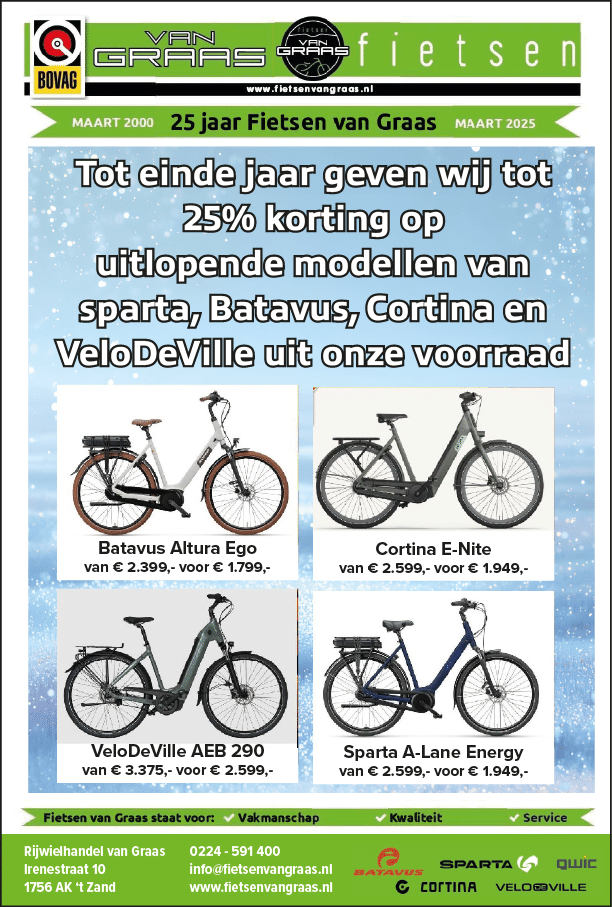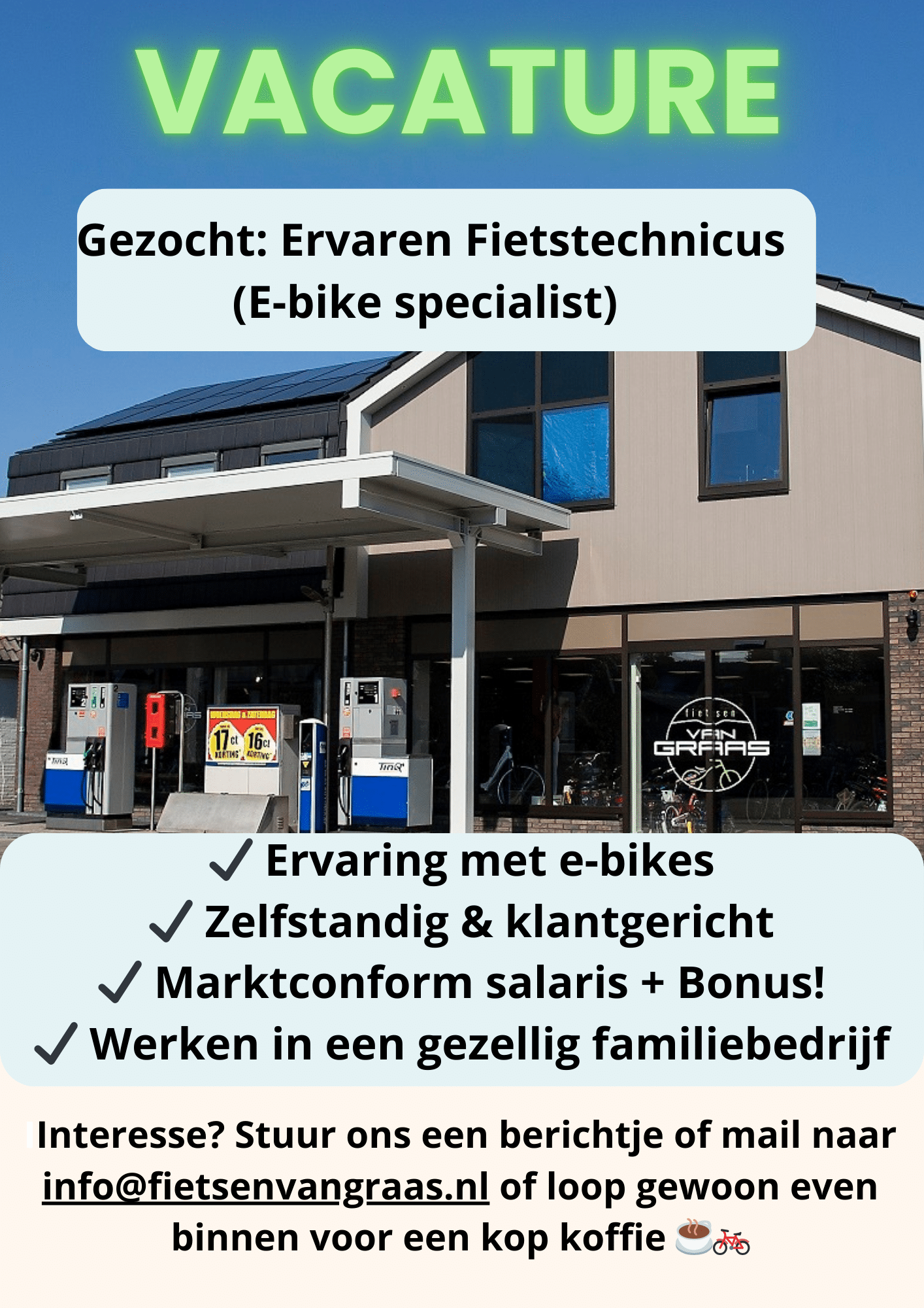 Bent u op zoek naar een fietswinkel in Schagen? Dan zit u hiervoor goed bij Fietsen van Graas. Sinds mei 2022 is zoon Jop van Graas fulltime aan het werk bij Fietsen van Graas. Vader Frank en zoon Jop van Graas richten zich op de reparatie en verkoop van fietsen en elektrische fietsen.